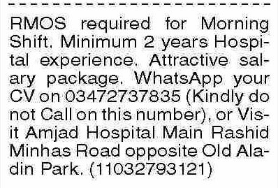 Vacant posts including resident medical officer, doctor and rmo are announced in Amjad Hospital Rashid Minhas Road Karachi, karachi Sindh Pakistan as per 13 October 2025 advertisement in daily Dawn Newspaper. Preferred Education is MBBS and Others etc.