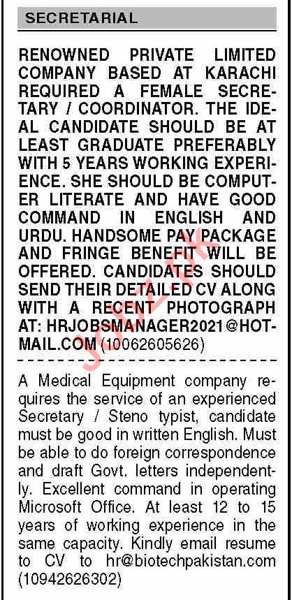 Dawn Sunday Classified Ads 12 Sep 2021 For Secretarial