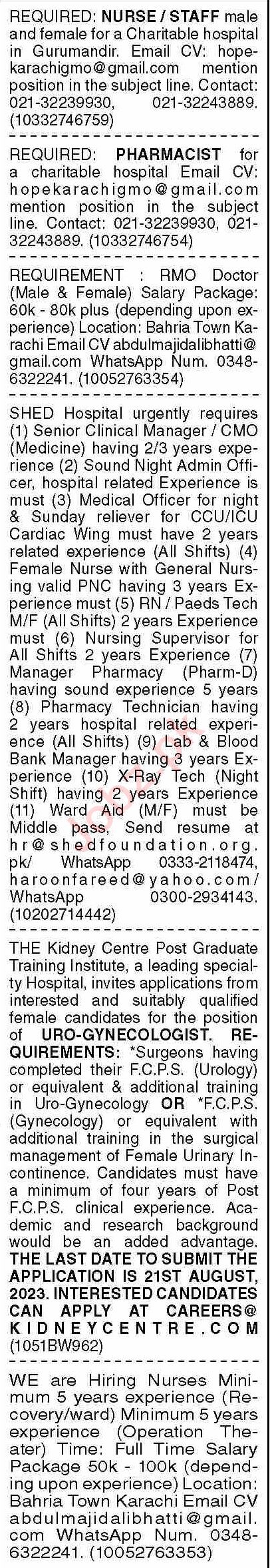 Hospital Clinic is looking for candidates for following posts as per job advertisement published in daily Dawn Newspaper of August 14, 2023 for location Karachi, karachi Sindh Pakistan: