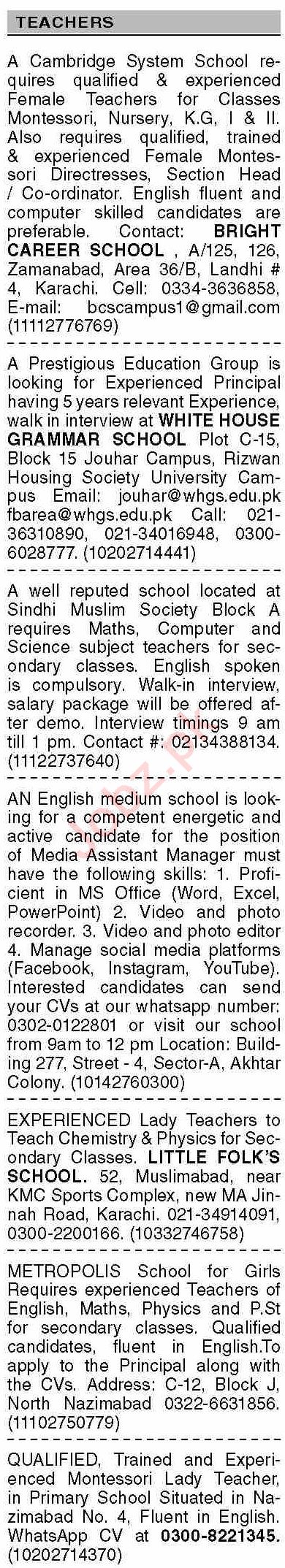 Private School jobs advertisement dated about 14 August 2023 in daily Dawn Newspaper invites application for the vacant post of english spoken teacher, coordinator, chemistry teacher, principal, physics teacher, video recorder, subject teacher, nursery teacher, photo recorder, teacher, primary school teacher, science teacher, lady teacher, computer teacher, manager social media, video editor, maths teacher, montessori teacher, media assistant manager, section head, pakistan studies teacher, kg teacher, photo editor, montessori directress and montessori lady teacher in Karachi, karachi Sindh Pakistan. Preferred Education is Bachelor, MS, M.ed, B.ed, MA, M.sc, BA, Intermediate, DAE and Master etc.