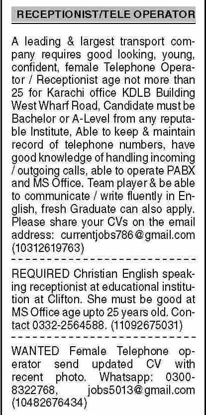 Dawn Sunday Classified Ads 13 Feb 2022 For Receptionist