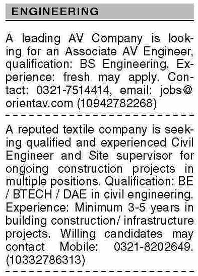 Engineering Company jobs advertisement dated about 14 July 2025 in daily Dawn Newspaper invites application for the vacant post of site supervisor, engineer, associate av engineer and civil engineer in Karachi, karachi Sindh Pakistan. Bachelor, Intermediate, DAE and B.E etc. educational qualification will be preferred.