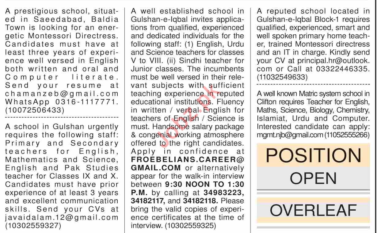 Principal, Vice Principal, Teacher, English Teacher, Chemistry Teacher, Physics Teacher, Coordinator, Biology Teacher, Maths Teacher, Urdu Teacher, Art Teacher, Biology Teacher, English Teacher, ESL Teacher, High School Teacher, History Teacher, Kindergarten Teacher, Middle School Teacher, Montessori Teacher, Music Teacher, PE Teacher, Preschool Teacher needs in well reputed schools.