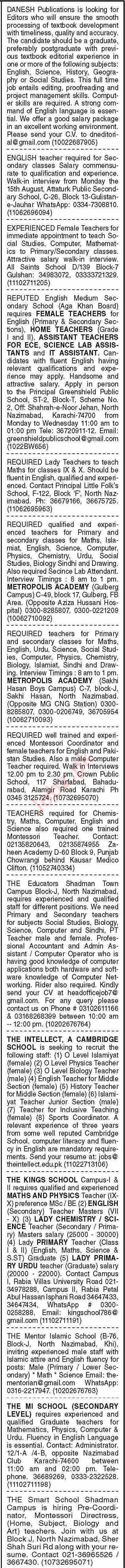 Private School jobs advertisement dated about 15 August 2022 in daily Dawn Newspaper invites application for the vacant post of physics teacher, sindhi teacher, computer teacher, maths teacher, biology teacher, computer operator, accountant, geography teacher, home teacher, urdu teacher, teacher, a level teacher, english teacher, mathematics teacher, social studies teacher, drawing teacher, science teacher, assistant teacher, chemistry teacher, admin assistant, o level teacher, secondary class teacher, montessori coordinator, montessori teacher, history teacher, islamiat teacher, pt teacher, lab attendant, lady teacher, it assistant and science lab assistant in Karachi, karachi Sindh Pakistan. Educational qualifications required Master, Bachelor and Intermediate etc.