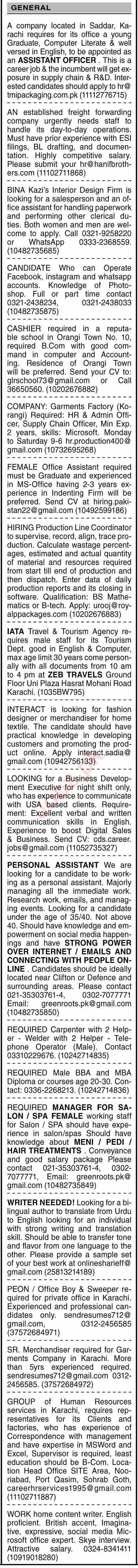 Vacant posts including manager, writer, travel agent, office staff, social media expert, sweeper, fashion designer, admin officer, production line coordinator, cashier, telephone operator, personal assistant, sales person, salon manager, business development executive, peon, assistant officer, welder, merchandiser, female office assistant, office assistant, carpenter, client service representative, spa manager, helper, office boy, pa, hr officer, supply chain officer and content writer are announced in Private Company Karachi, karachi Sindh Pakistan as per 16 January 2023 advertisement in daily Dawn Newspaper. Educational qualifications required Intermediate, Matric, Middle, Master and Bachelor etc.