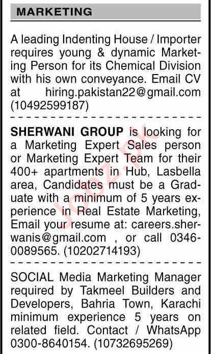 Marketing Company is looking for candidates for following posts as per job advertisement published in daily Dawn Newspaper of January 16, 2023 for location Karachi, karachi Sindh Pakistan: