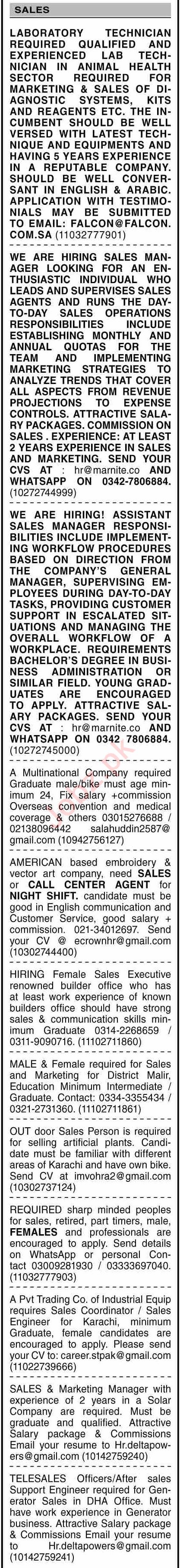 Marketing Company Karachi, karachi Sindh Pakistan invites applications from eligible candidates for the post of marketing manager, general manager, sales engineer, sales support engineer, sales executive, telesales officer, sales person, sales coordinator, call center agent, sales agent, graduate staff, sales manager, laboratory technician, sales officer, assistant sales manager and marketing officer as per advertisement of January 16, 2023 published in daily Dawn Newspaper. Preferred Education is Bachelor, Middle, Intermediate and Matric etc.