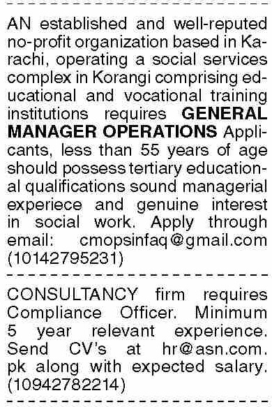 Vacant posts including general manager operations and compliance officer are announced in Private Company Korangi Karachi, karachi Sindh Pakistan as per 16 June 2025 advertisement in daily Dawn Newspaper. Master and Bachelor etc. educational qualification will be preferred.