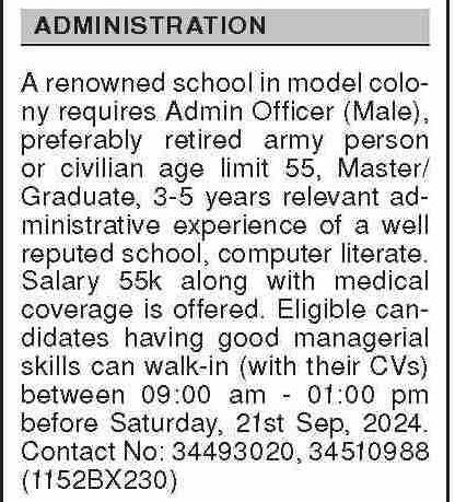 Private School jobs advertisement dated about 16 September 2024 in daily Dawn Newspaper invites application for the vacant post of admin officer in Karachi, karachi Sindh Pakistan. Candidates with Master and Bachelor etc. educational background will be preferred.