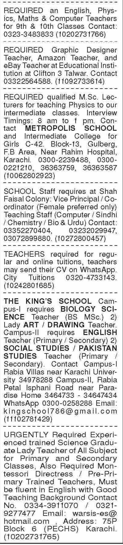 Vacant posts including drawing teacher, urdu teacher, social studies teacher, sindhi teacher, graphic designer, montessori directress, female teacher, biology teacher, maths teacher, art teacher, teacher, ebay teacher, primary teacher, english teacher, computer teacher, chemistry teacher, physics teacher, coordinator, pakistan studies teacher, amazon teacher, vice principal and secondary teacher are announced in Private School Karachi, karachi Sindh Pakistan as per 16 September 2024 advertisement in daily Dawn Newspaper. Bachelor, M.sc, B.ed, Master and MA etc. educational qualification will be preferred.