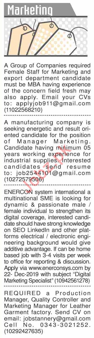 Dawn Sunday Classified Ads 15th Dec 2019 For Marketing Staff