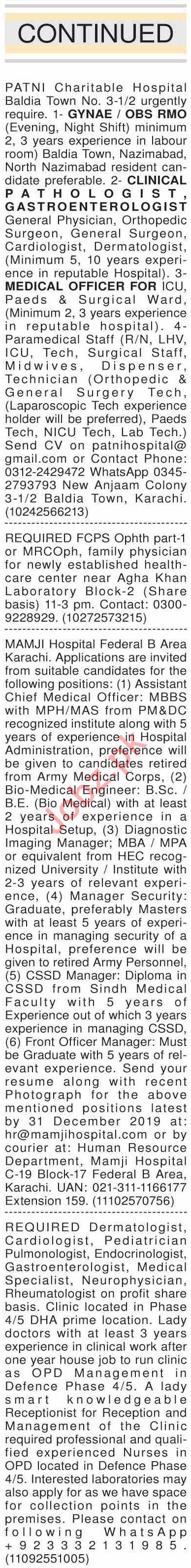 Medical Officer, Radiologist, Nurse, LHV, Doctor, Lady Doctor, Pharmacist, Midwives, Gynecologist, Receptionist, Dispenser, Resident Medical Officer, Pathologist, ICU Technician, CT Scan Technician, X Ray Technician, House Officer, Nursing Instructor, CCTV Assistant, Lab Technician seeks in well reputed hospitals.