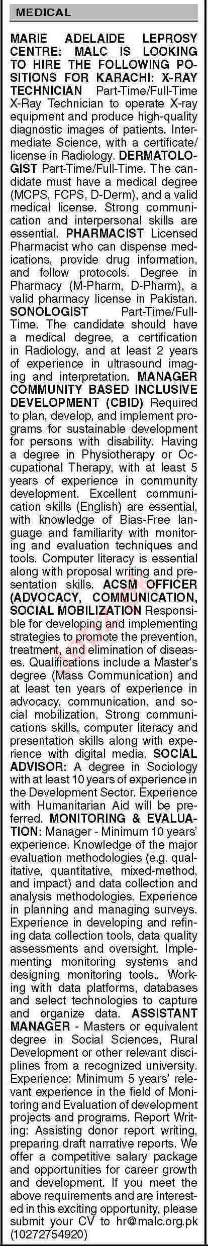 Marie Adelaide Leprosy Centre is looking for candidates for following posts as per job advertisement published in daily Dawn Newspaper of April 17, 2023 for location Karachi, karachi Sindh Pakistan: