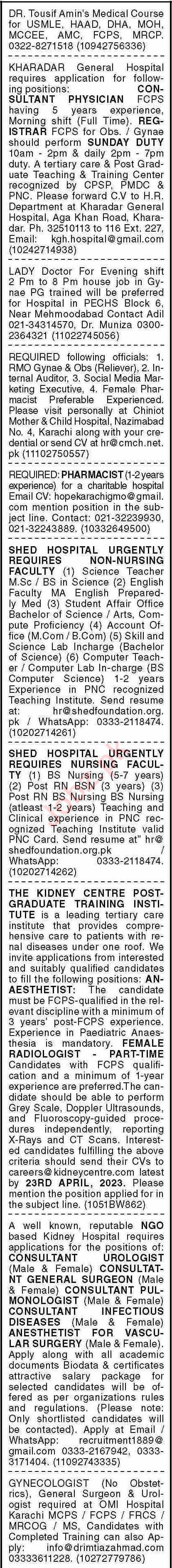 Vacant posts including fcps doctor, doctor, science teacher, consultant physician, english teacher, consultant urologist, social media marketing executive, female pharmacist, pharmacist, computer teacher, registrar, anaesthetist, student affair officer, consultant infectious diseases, urologist, consultant pulmonologist, account officer, computer lab incharge, internal auditor, radiologist, lecturer, rmo, female radiologist, resident medical officer, gynecologist, anesthetist, consultant general surgeon, science lab incharge, general surgeon, teacher and lady doctor are announced in Hospital Clinic Karachi, karachi Sindh Pakistan as per 17 April 2023 advertisement in daily Dawn Newspaper. Candidates with B Pharmacy, M.com, M.ed, Pharma D, B.com, M.sc, BCS, BIT, MS, BBA, MBA, MA, B.ed, Others and MBBS etc. educational background will be preferred.