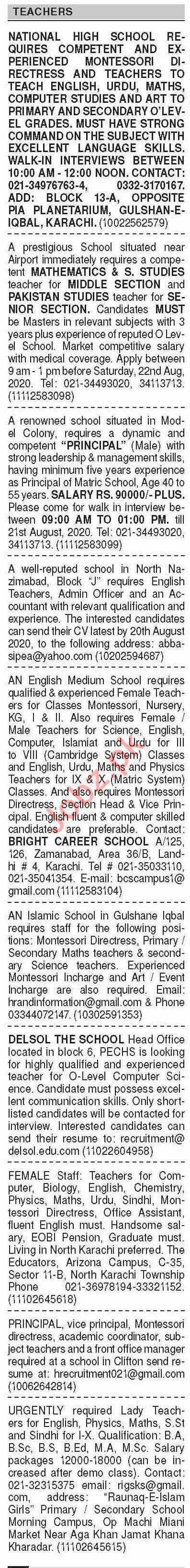 Dawn Sunday Classified Ads 16 Aug 2020 For Teaching Staff
