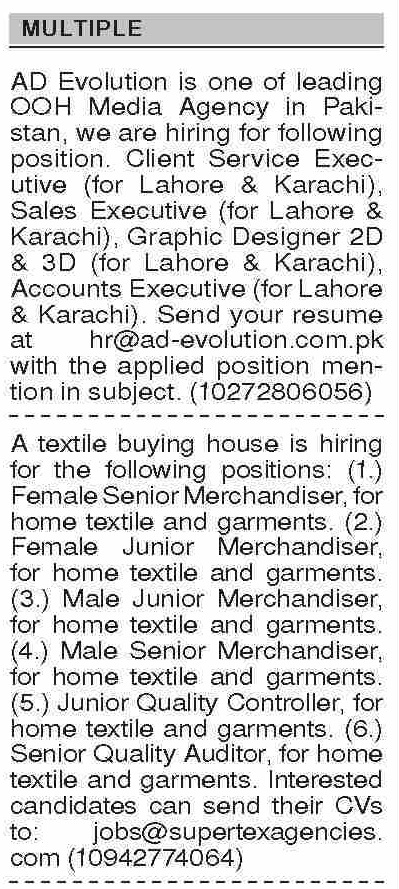 Private Company jobs advertisement dated about 17 February 2025 in daily Jang Newspaper invites application for the vacant post of graphic designer, merchandiser, sales executive, quality controller, accounts executive, quality auditor and client service executive in Karachi, lahore Sindh Pakistan. Preferred Education is BA, Bachelor and Intermediate etc.