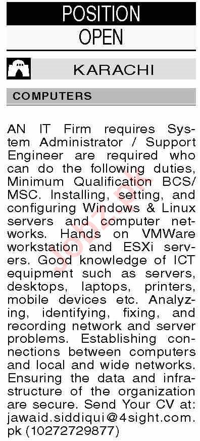 Multinational IT Firm Karachi, karachi Sindh Pakistan invites applications from eligible candidates for the post of support engineer and system administrator as per advertisement of June 18, 2024 published in daily Dawn Newspaper. BCS, M.sc and MCS etc. educational qualification will be preferred.
