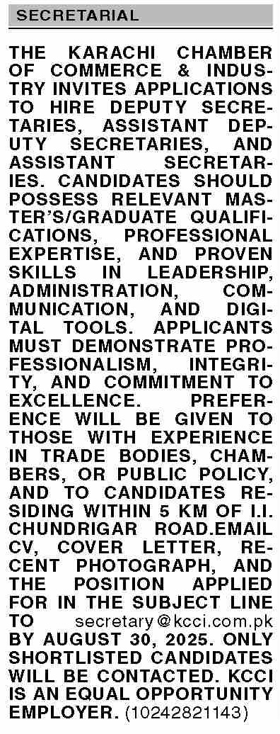 Karachi Chamber of Commerce & Industry latest Classifieds Secretarial jobs and others can be applied till 30 August 2025 or as per closing date in newspaper ad. Read complete ad online to know how to apply on latest Karachi Chamber of Commerce & Industry job opportunities.