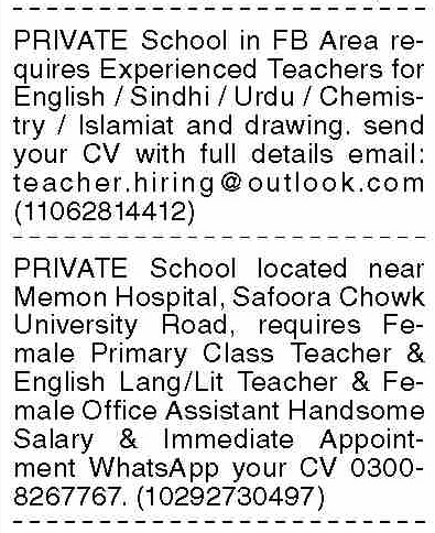 Vacant posts including english teacher, urdu teacher, teacher, english language teacher, primary teacher, female teacher, islamiat teacher, drawing teacher, chemistry teacher, office assistant and sindhi teacher are announced in Private School Karachi, karachi Sindh Pakistan as per 18 August 2025 advertisement in daily Dawn Newspaper. Preferred Education is Bachelor, Others, BA, Master, M.sc and MA etc.
