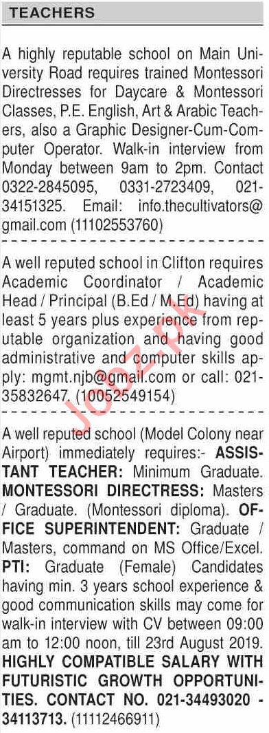 Principal, Vice Principal, Coordinators, Teacher, Junior Teacher, Primary Teacher, Secondary Teacher, Subject Teacher (Maths, Physics, Chemistry, Biology, English, Urdu, Pak Studies & Islamic Studies), Montessori Teacher and Female Teacher seeks in well result oriented schools.