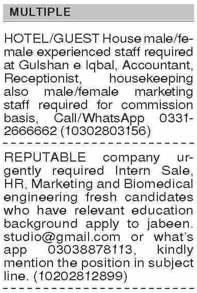 Private Company jobs advertisement dated about 20 January 2025 in daily Dawn Newspaper invites application for the vacant post of receptionist, intern sales, accountant, hr offficer, housekeeping staff, biomedical engineer and marketing officer in Karachi, karachi Sindh Pakistan. Persons with B.com, BA, Bachelor and Intermediate etc. education can apply.