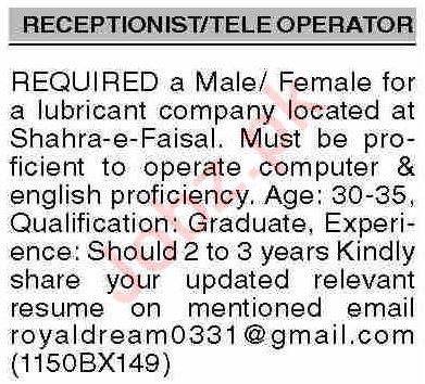 Vacant posts including telephone operator, receptionist and computer operator are announced in Oil Lubricant Company Karachi, karachi Sindh Pakistan as per 20 May 2024 advertisement in daily Dawn Newspaper. Educational qualifications required Bachelor, BA and Intermediate etc.