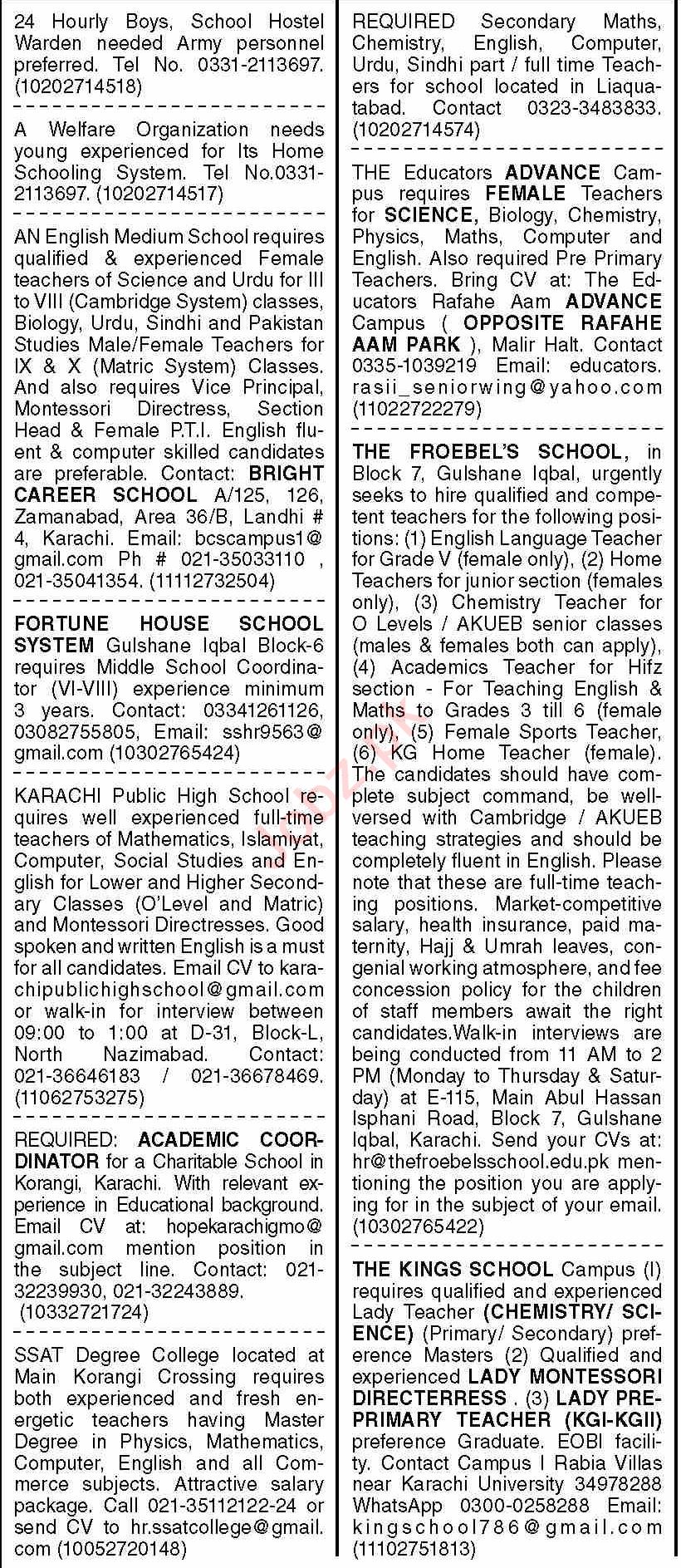 Private School invites applications for job positions advertised in daily Dawn dated 20 November 2023 for following vacancies in Karachi, karachi Sindh Pakistan.
