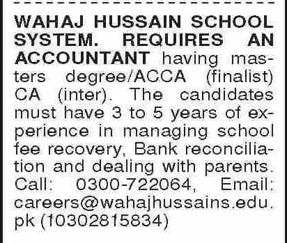 Apply at Wahaj Hussain School System WHSS latest Classifieds jobs in Accounting and departments before closing date which is around November 4, 2025 or as per closing date in newspaper ad. Read complete ad online to know how to apply on latest Wahaj Hussain School System WHSS job opportunities.