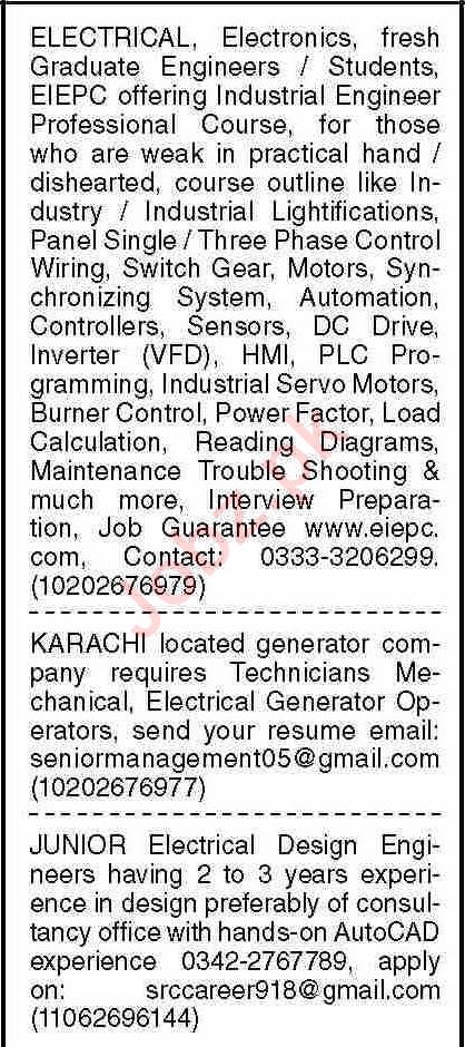 Engineering Company Karachi, karachi Sindh Pakistan invites applications from eligible candidates for the post of electrical design engineer, automation controller, electrical engineer, electrical technician, industrial engineer, engineer, generator operator, electronics engineer and mechanical technician as per advertisement of September 19, 2022 published in daily Dawn Newspaper. Persons with Bachelor, Intermediate and Matric etc. education can apply.