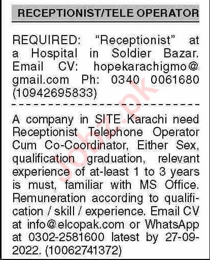 Private Company jobs advertisement dated about 19 September 2022 in daily Dawn Newspaper invites application for the vacant post of telephone operator, receptionist and coordinator in Karachi, karachi Sindh Pakistan. Persons with Bachelor and Intermediate etc. education can apply.