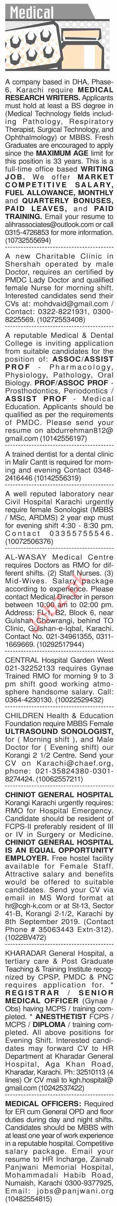 Dawn Sunday Classified Ads 1st Sep 2019 for Medical Staff