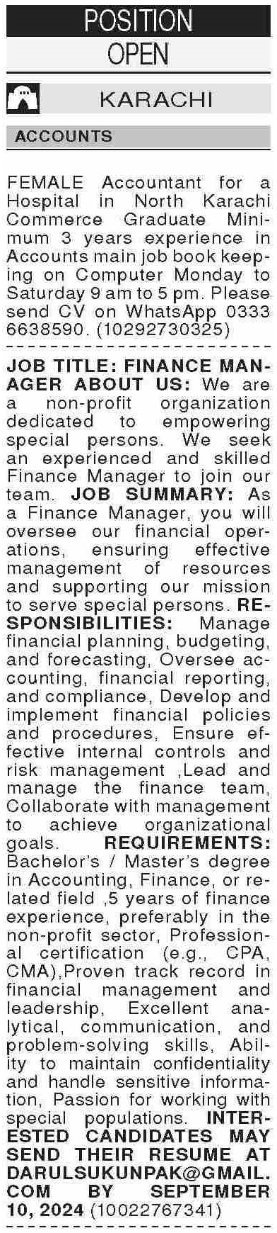 Dawn Sunday Classified Ads 1st Sep 2024 for Accounts Staff