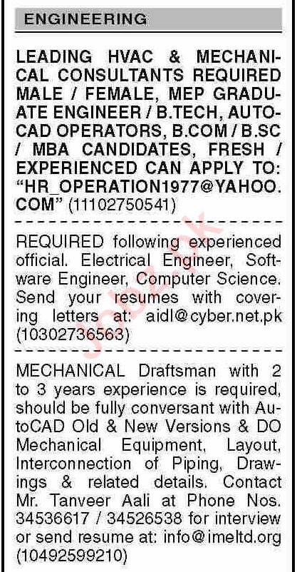 Engineering Company jobs advertisement dated about 3 April 2023 in daily Dawn Newspaper invites application for the vacant post of hvac consultant, mechanical consultant, electrical engineer, mechanical draftsman, engineer, computer science engineer and software engineer in Karachi, karachi Sindh Pakistan. Candidates with Matric, Intermediate and Bachelor etc. educational background will be preferred.