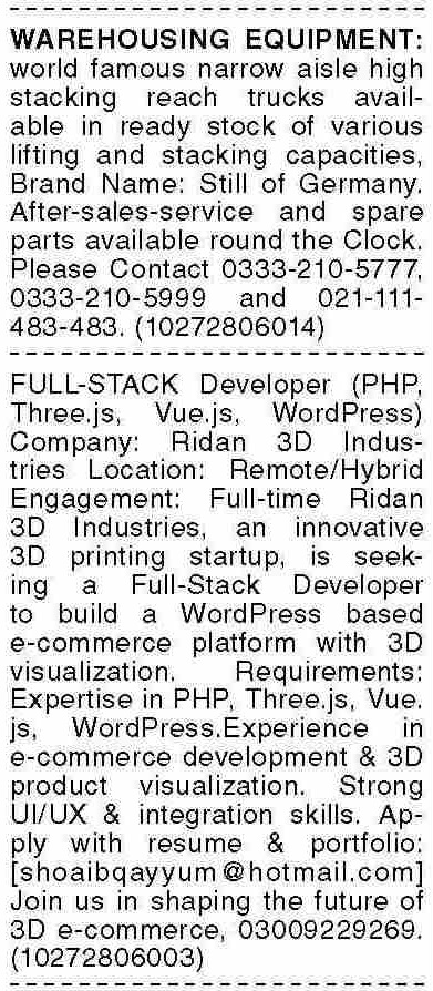 Private Company jobs advertisement dated about 3 February 2025 in daily Dawn Newspaper invites application for the vacant post of full stack developer and warehousing supervisor in Karachi, karachi Sindh Pakistan. Educational qualifications required Intermediate and Bachelor etc.