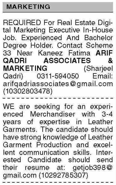 Marketing Company Karachi, karachi Sindh Pakistan invites applications from eligible candidates for the post of digital marketing executive and merchandiser as per advertisement of February 3, 2025 published in daily Dawn Newspaper. Intermediate, Bachelor and BA etc. educational qualification will be preferred.