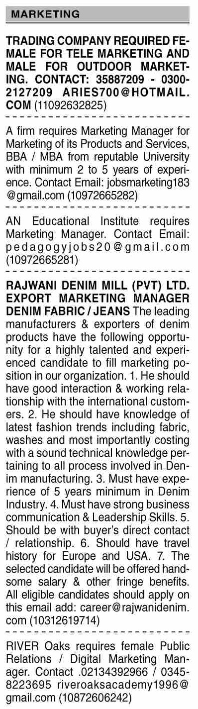 Dawn Sunday Classified Ads 2 Jan 2022 For Marketing Staff