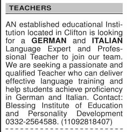 Vacant posts including teacher, italian language teacher, german language teacher and language expert are announced in Blessing Institute of Education & Personality Development Clifton Karachi, karachi Sindh Pakistan as per 3 November 2025 advertisement in daily Dawn Newspaper. Preferred Education is Bachelor etc.