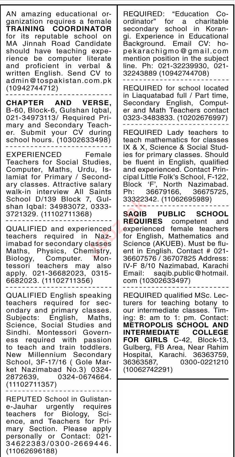 Private School invites applications for job positions advertised in daily Dawn dated 3 October 2022 for following vacancies in Karachi, karachi Sindh Pakistan.