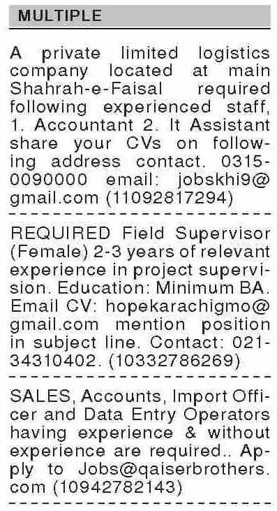 Vacant posts including accountant, field supervisor, it assistant, sales officer, import officer, accounts officer and data entry operator are announced in Private Company Shahrah-e-Faisal Karachi, karachi Sindh Pakistan as per 21 April 2025 advertisement in daily Dawn Newspaper. Persons with Bachelor, B.com, BA, Matric, Intermediate and Middle etc. education can apply.