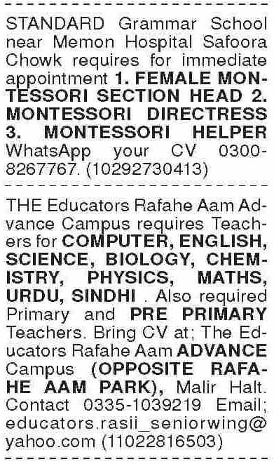Private School jobs advertisement dated about 21 April 2025 in daily Dawn Newspaper invites application for the vacant post of sindhi teacher, montessori helper, lady teacher, english teacher, urdu teacher, pre primary teacher, computer teacher, montessori section head, montessori directress, physics teacher, science teacher, teacher, chemistry teacher and maths teacher in Malir Halt Karachi, karachi Sindh Pakistan. Preferred Education is B.ed, M.sc, MA, Intermediate, Bachelor, Master and BA etc.