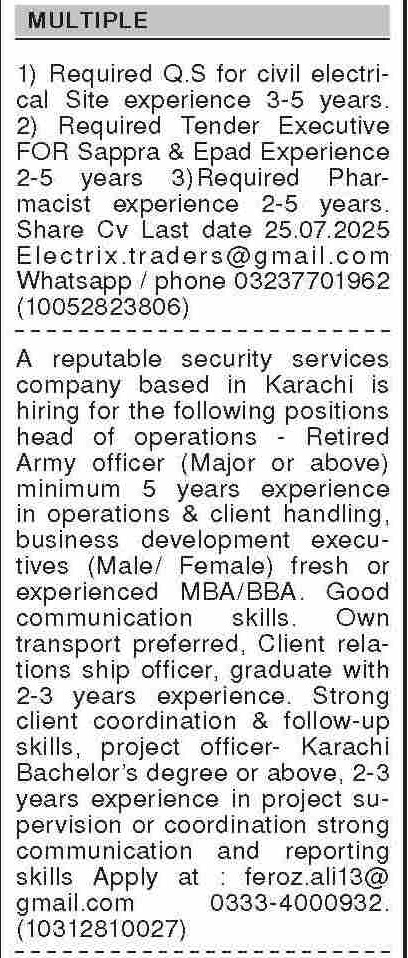 Private Company invites applications for job positions advertised in daily Dawn dated 21 July 2025 for following vacancies in Karachi, karachi Sindh Pakistan.