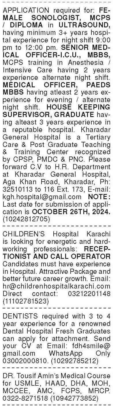 Dawn Sunday Classified Ads 20 Oct 2024 For Medical Staff