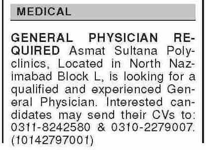 Asmat Sultana Polyclinics North Nazimabad - Block L Karachi, karachi Sindh Pakistan invites applications from eligible candidates for the post of general physician as per advertisement of September 22, 2025 published in daily Dawn Newspaper. Bachelor, DPT and Others etc. educational qualification will be preferred.
