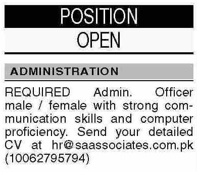 SA Associates & builders Shahrah-e-Faisal Karachi, karachi Sindh Pakistan invites applications from eligible candidates for the post of administrator and admin officer as per advertisement of June 23, 2025 published in daily Dawn Newspaper. Educational qualifications required BA, Bachelor and Others etc.