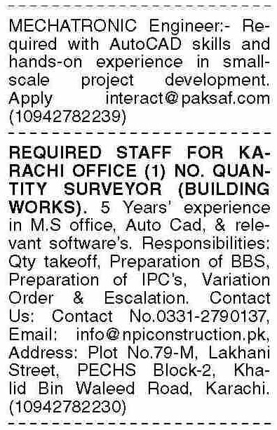 NPI Construction & Engineering jobs advertisement dated about 23 June 2025 in daily Dawn Newspaper invites application for the vacant post of mechatronic engineer, engineer and quantity surveyor in PECHS Block 2 Karachi, karachi Sindh Pakistan. Bachelor, B.E, Intermediate and DAE etc. educational qualification will be preferred.