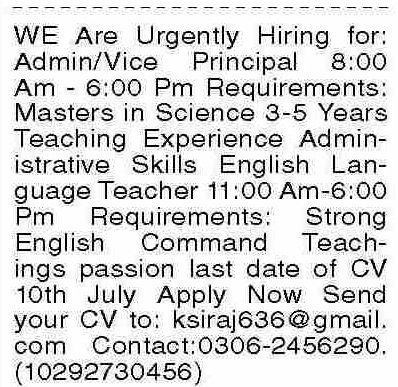 Latest Classifieds jobs in Private School in Education and others can be applied till 12 July 2025 or as per closing date in newspaper ad. Read complete ad online to know how to apply on latest Private School job opportunities.