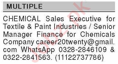 Textile Chemical Company Karachi, karachi Sindh Pakistan invites applications from eligible candidates for the post of sales executive and chemical sales executive as per advertisement of June 24, 2024 published in daily Dawn Newspaper. Educational qualifications required B.E, BA and Bachelor etc.