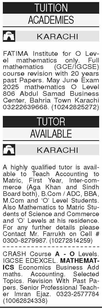 Academy Karachi, karachi Sindh Pakistan invites applications from eligible candidates for the post of o level teacher, tutor, mathematics teacher, teacher and home tutor as per advertisement of March 24, 2025 published in daily Dawn Newspaper. Educational qualifications required Master and Bachelor etc.