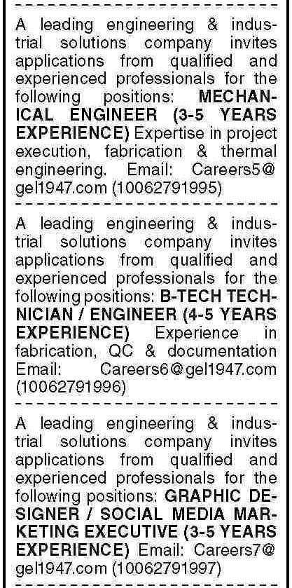 Leading Engineering Company jobs advertisement dated about 24 November 2025 in daily Dawn Newspaper invites application for the vacant post of engineer, socail media marketing executive, b tech engineer, mechanical engineer, graphic designer and qc technician in Karachi, karachi Sindh Pakistan. Educational qualifications required B.E, DAE, Others, Intermediate and Bachelor etc.
