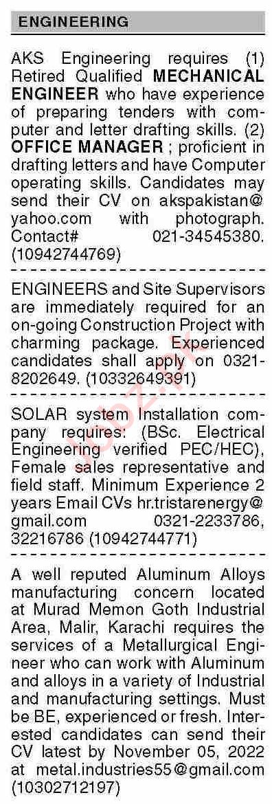 Vacant posts including field staff, office manager, mechanical engineer, electrical engineer, metallurgical engineer, engineer, site supervisor and sales representative are announced in Engineering Company Karachi, karachi Sindh Pakistan as per 24 October 2022 advertisement in daily Dawn Newspaper. Candidates with Bachelor, Matric and Intermediate etc. educational background will be preferred.